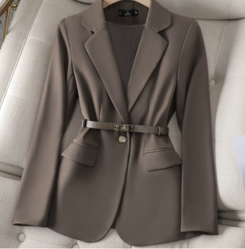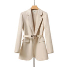 This women’s blazer features long sleeves and a collar with lapels. The blazer has a single button closure. A belt with a buckle is attached at the waist. Front pockets with flaps are visible on both sides.