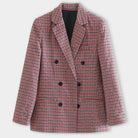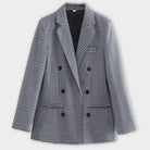 Women’s blazer featuring an all-over checked pattern. Designed with a double-breasted front and two rows of buttons. Includes notched lapels and long sleeves with buttoned cuffs. The blazer has a straight hem and two front welt pockets.