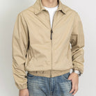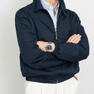 This men’s full-zip jacket has long sleeves and a zip closure running down the front. The jacket features a flat collar that sits neatly around the neckline. Elastic detailing is visible at the cuffs and along the lower edge. Two side pockets are positioned at the front.