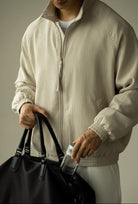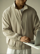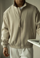 This men’s jacket features a stand-up collar that sits neatly around the neck. The jacket has a full zip closure. A ribbed structure is visible across the entire surface. The cuffs and hem have an elasticated finish. Two side pockets are positioned at the front.