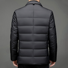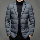 Men’s padded jacket with a visible lapel collar. The jacket has long sleeves and a button closure. Two front flap pockets are positioned on the lower sides.