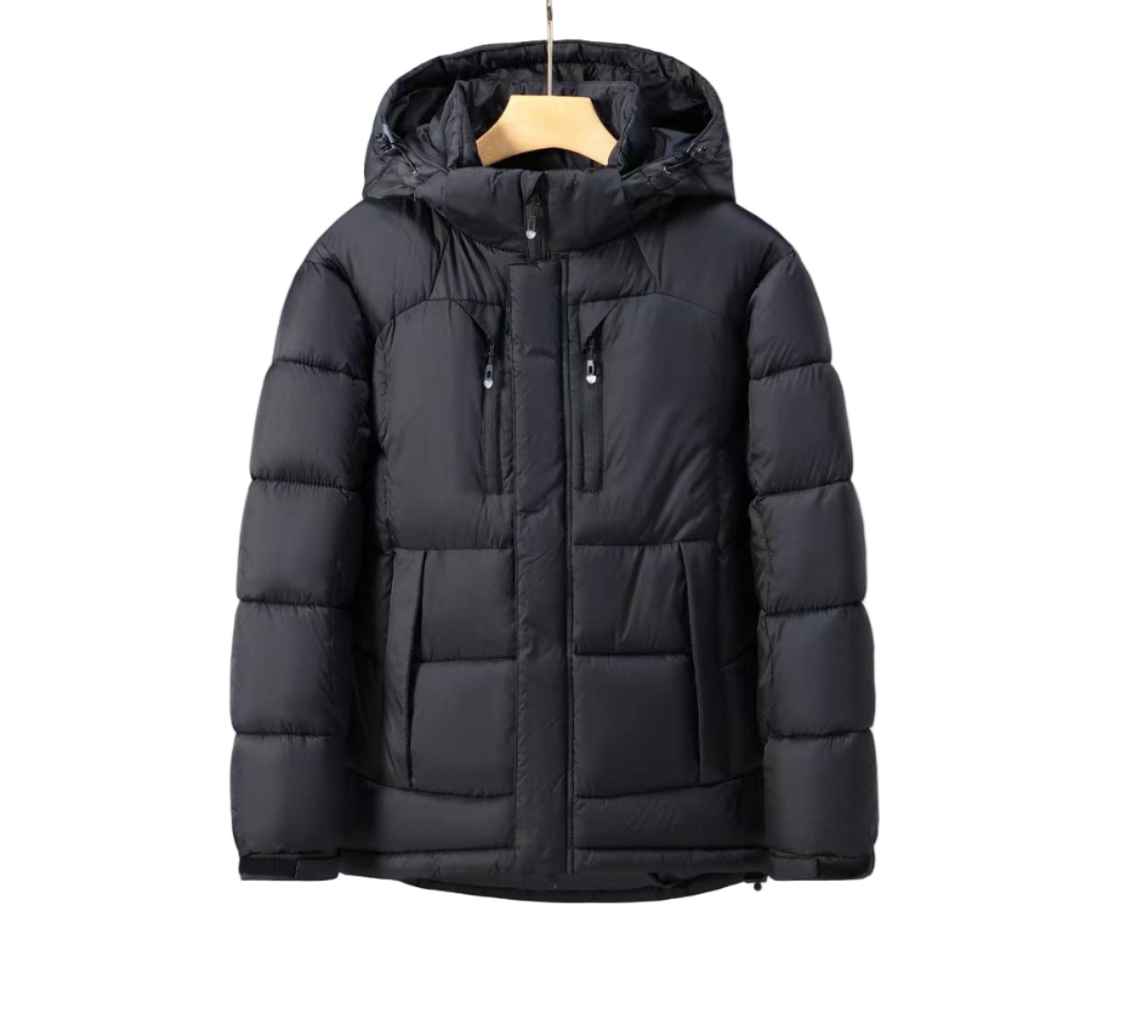 This men’s puffer jacket features long sleeves and a front zipper closure. The jacket has a padded, quilted structure across the entire surface. Two vertical zip pockets are visible on the chest. The lower front area includes two additional pockets along the sides.