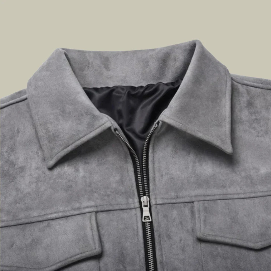 This men’s cargo jacket features long sleeves and a front zipper closure. Four pockets are positioned on the front, with two placed on the chest and two lower pockets. The jacket has a straight hem and a pointed collar.