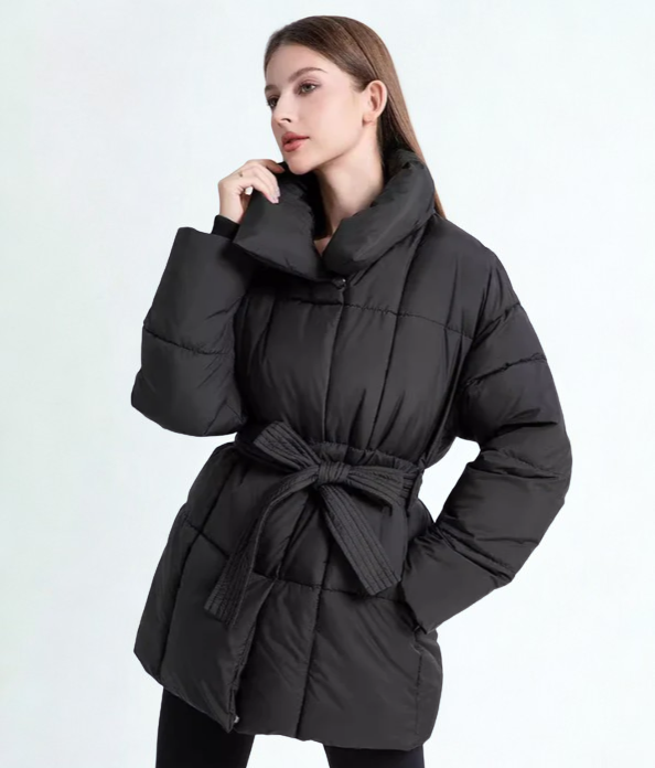Women’s Puffer Jacket with Belt and Stand Collar