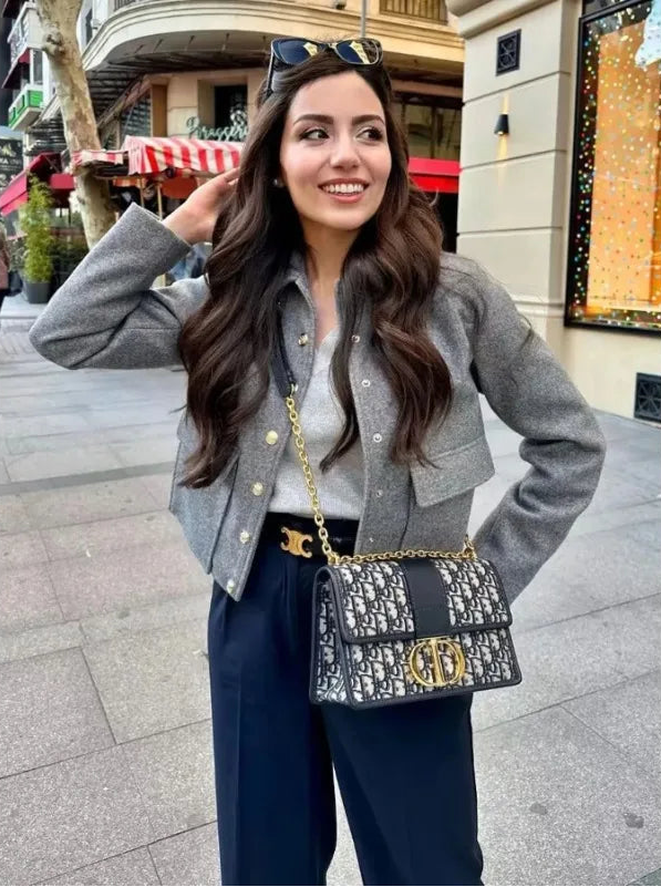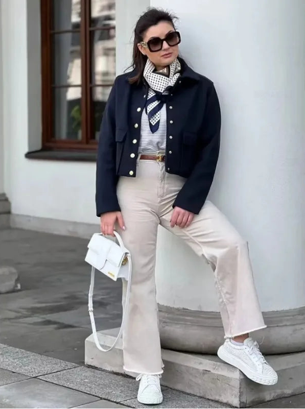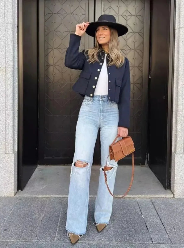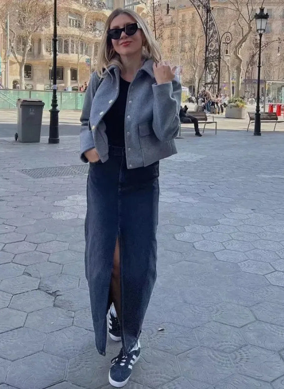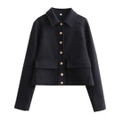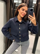 This women’s cropped jacket features a full row of front buttons. It has long sleeves and a regular collar. Two flap pockets are positioned on the lower front. The hem is cut at a cropped length.