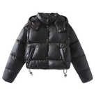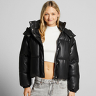 This women’s cropped puffer jacket features a high stand-up collar. It has a button closure along the front. The jacket has long sleeves and a quilted exterior. Two front pockets are positioned on each side.