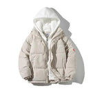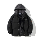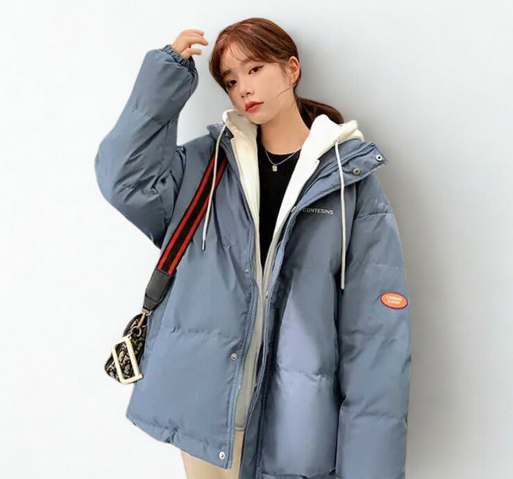Women’s puffer jacket featuring a layered hood design. The jacket has a front zipper with snap button placket and side pockets. It shows horizontal quilted stitching for a padded, structured look.