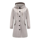 This women's long rain jacket features an attached hood with an adjustable drawstring. The jacket has long sleeves with elasticated cuffs.