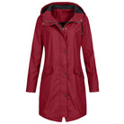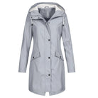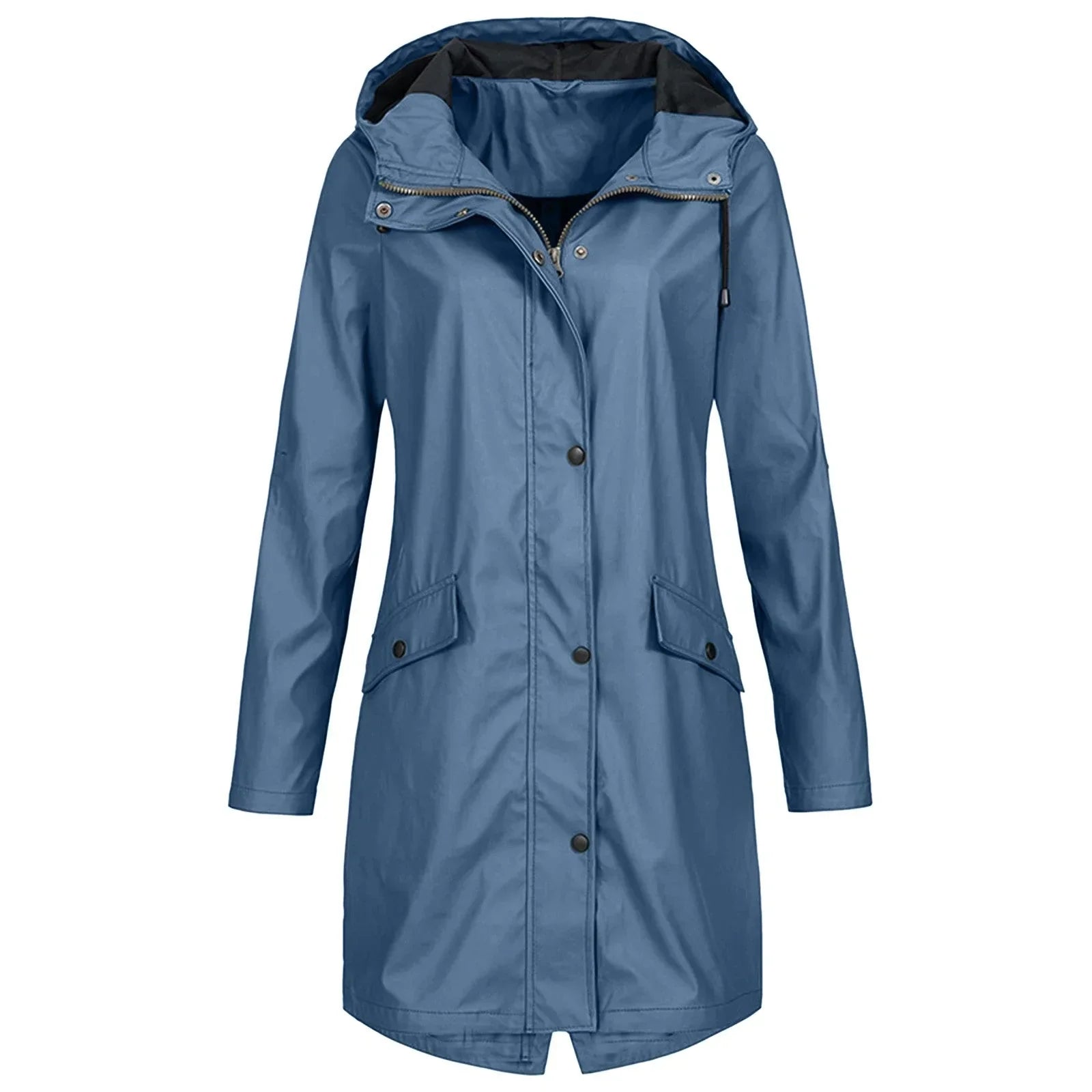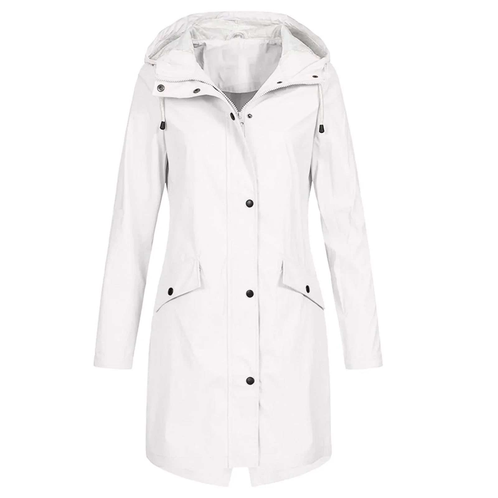 Women’s long raincoat with a hood and a front snap closure. The coat features long sleeves and a straight cut. It includes two front flap pockets with snaps. The hem is slightly rounded at the back.