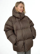 Women’s oversized puffer jacket with long sleeves and a hood. Features a snap closure at the front and a high padded collar. The jacket has an oversized fit with visible horizontal quilting.