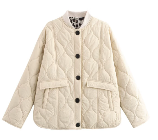 Women’s quilted jacket with long sleeves and front button closure. Designed with two flap pockets. The inside features a visible printed lining with a leopard pattern. Finished with a ribbed neckline and a straight hem.