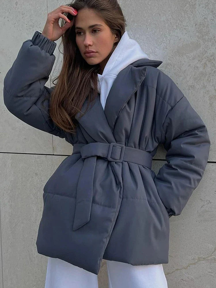 Women’s winter coat with a wrap front design. It features long sleeves and a belted waist. The coat has a padded panel structure with evenly stitched panels. The front has a folded collar shape created by the wrap design.