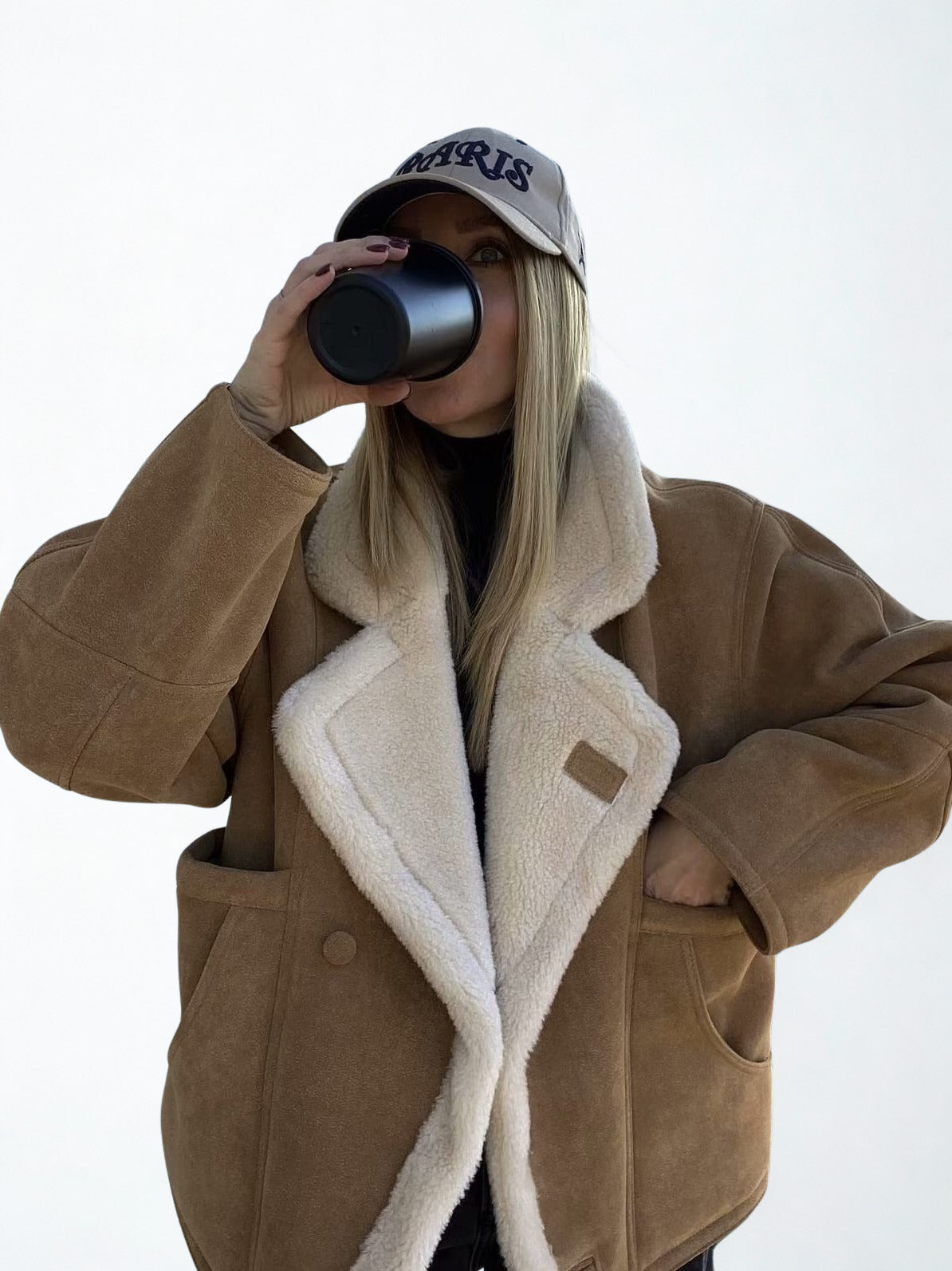 This women’s winter coat features long sleeves. The collar has a faux fur texture that runs along the inner front edge. The coat has two front pockets positioned on each side.