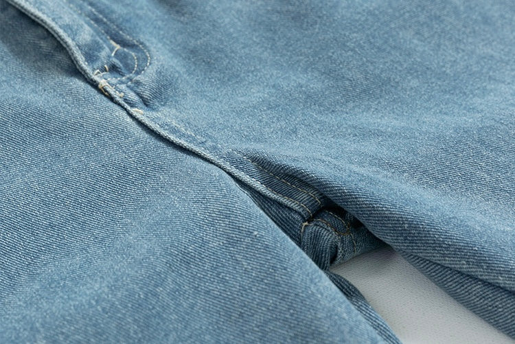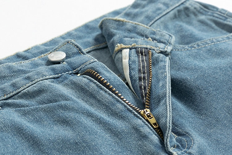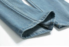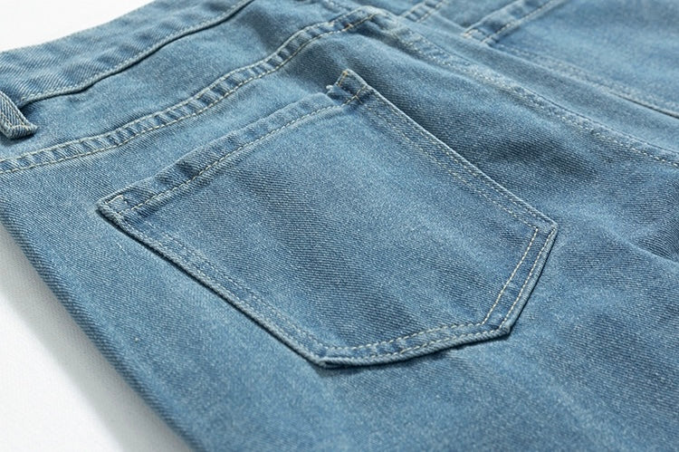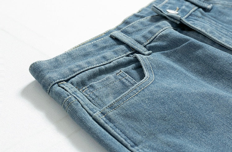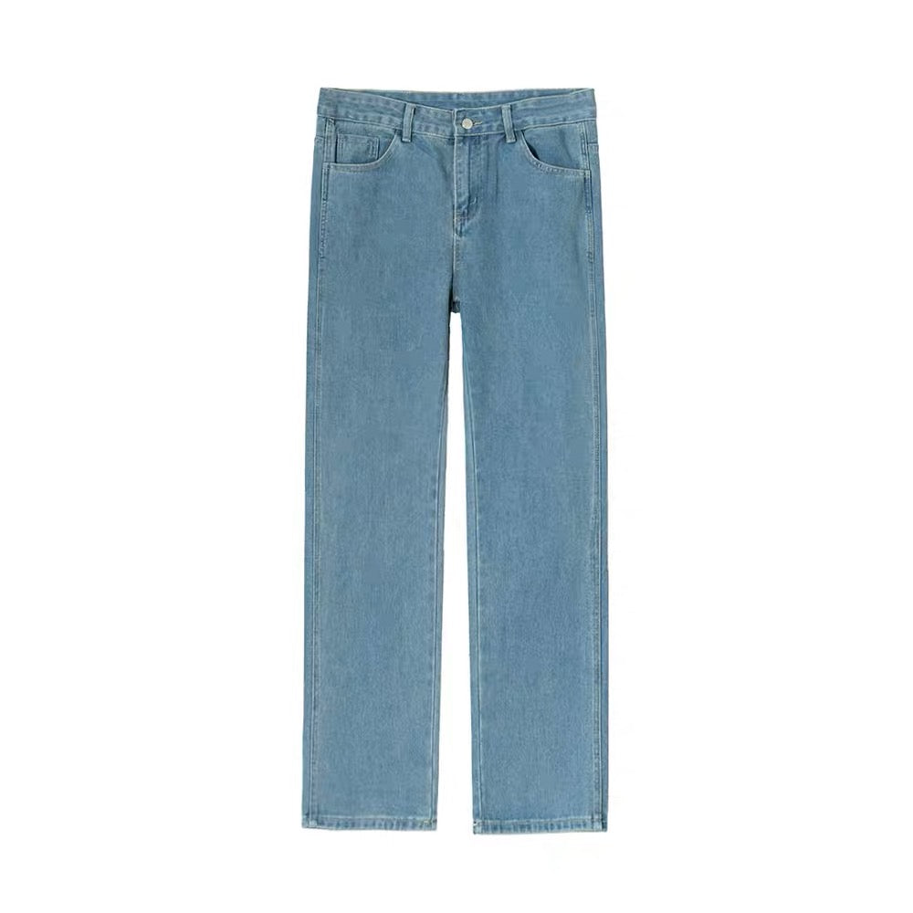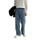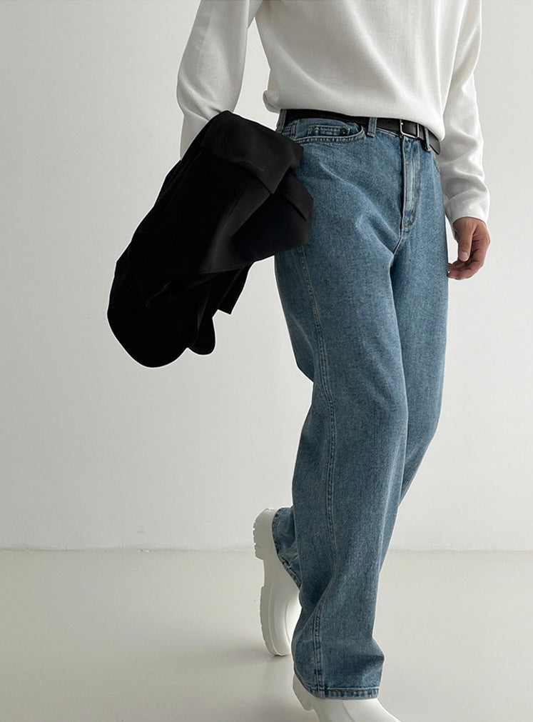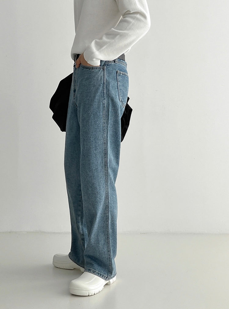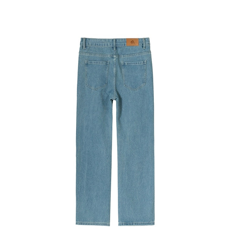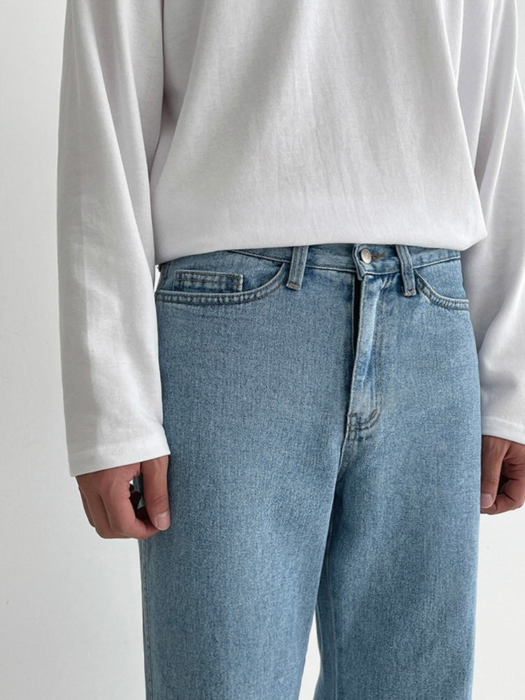 These men’s jeans feature a straight leg design with a full-length cut. The jeans have a button and zip fastening. Belt loops are visible around the waistband. Front and back pockets are present. The jeans are made from cotton.