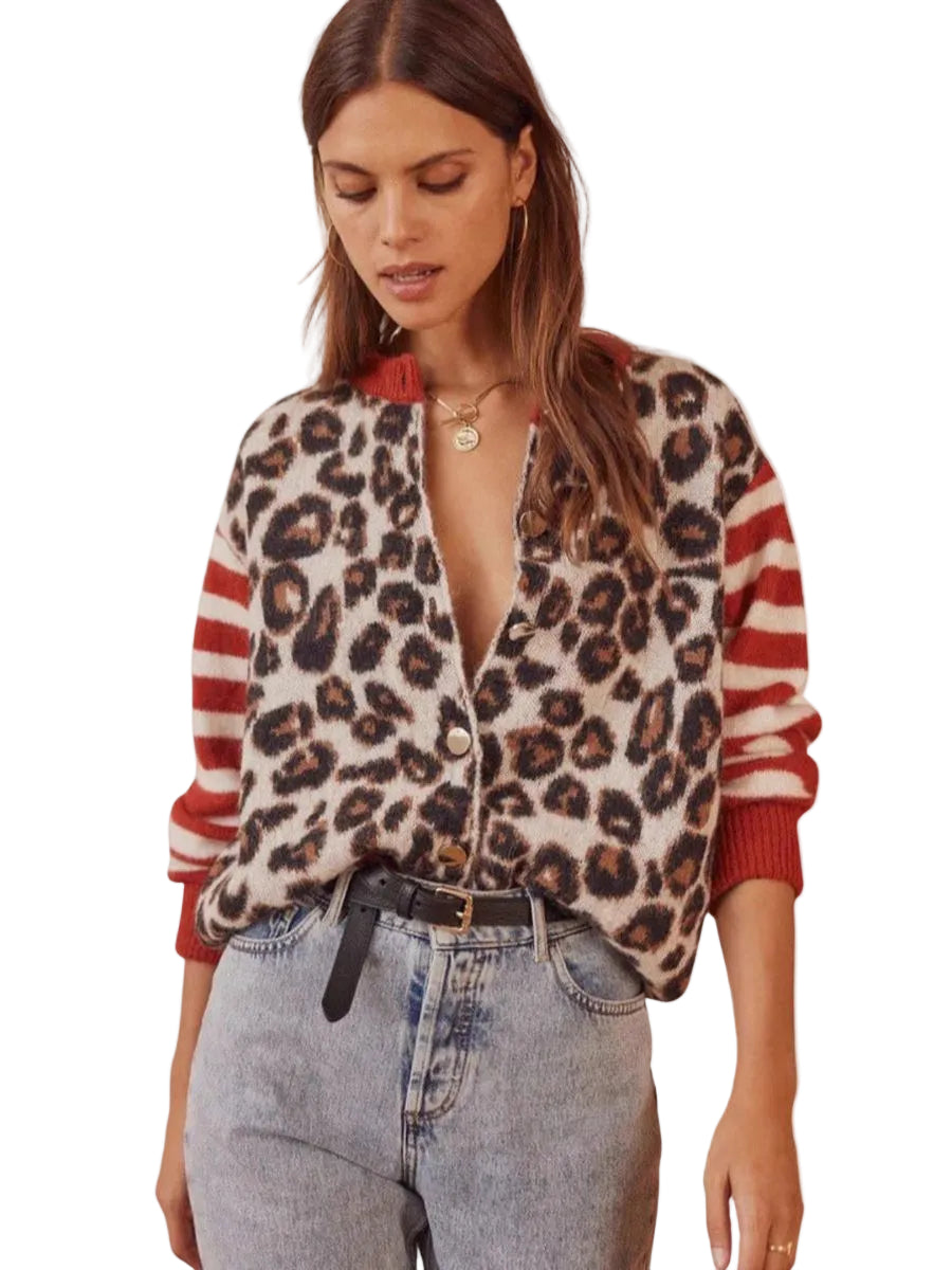 Women’s Cardigan with Leopard and Stripe Print and Button Closure
