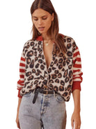 This women’s cardigan with long sleeves has a V-neckline and a button closure. The surface shows a leopard and stripe print pattern. The cuffs and hem are ribbed.