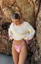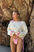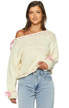 This women’s jumper has long sleeves and a wide neckline that sits off one shoulder. Bow details are visible along the neckline and sleeve cuffs. The knit shows an open, textured pattern across the body.
