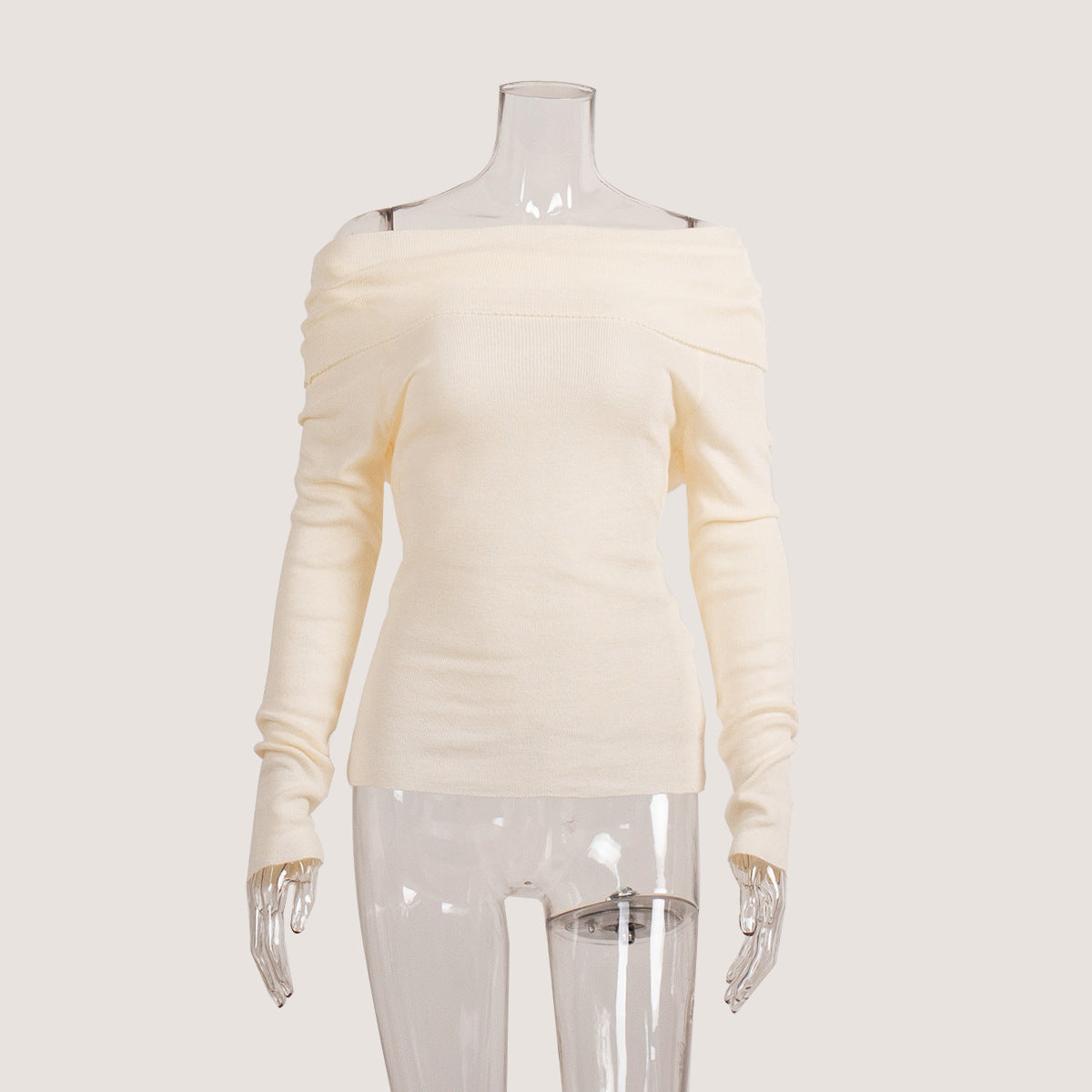 This women’s jumper features an off-shoulder neckline that sits across the shoulders. The jumper has long sleeves. The hem finishes at hip length.