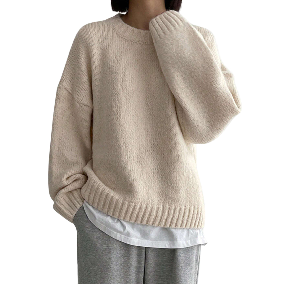 Women’s ribbed knit sweater with a loose fit and dropped shoulders. Features a round neckline and long sleeves. Designed with ribbed detailing at the neck, cuffs, and hem.