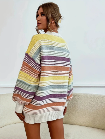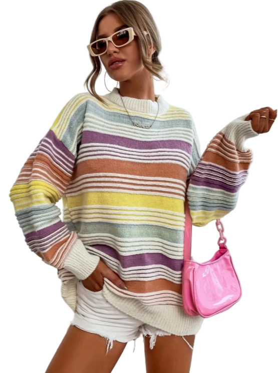 This women’s jumper features long sleeves and a round neckline. The design shows horizontal stripes across the entire surface. The jumper has a loose fit with a slightly longer back.