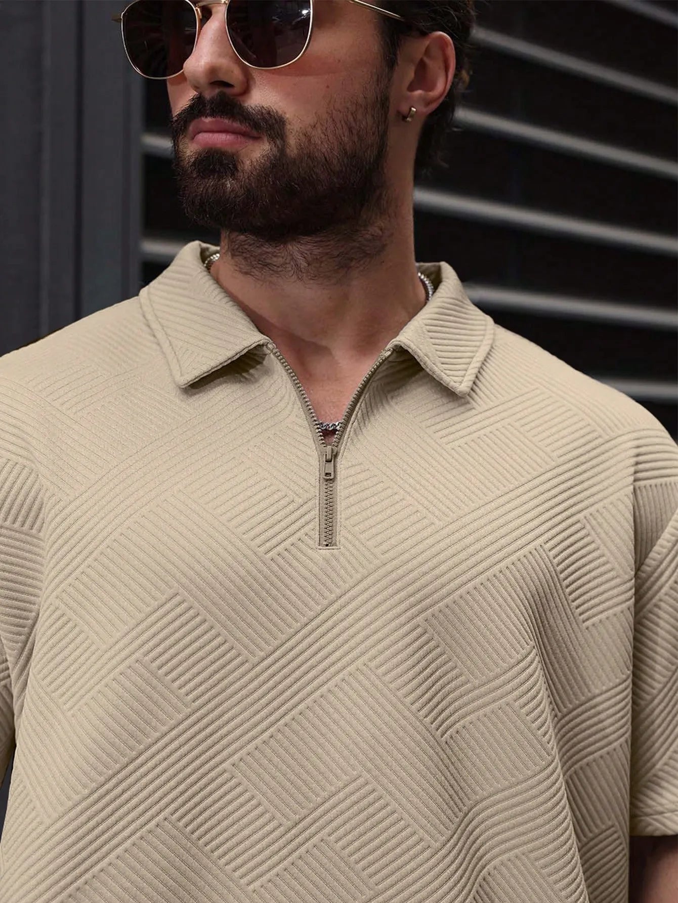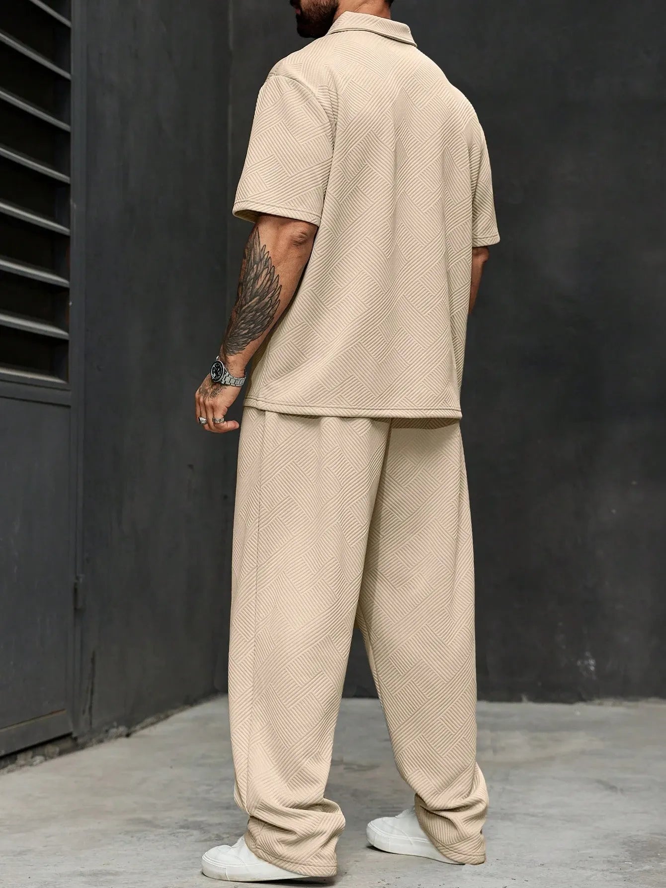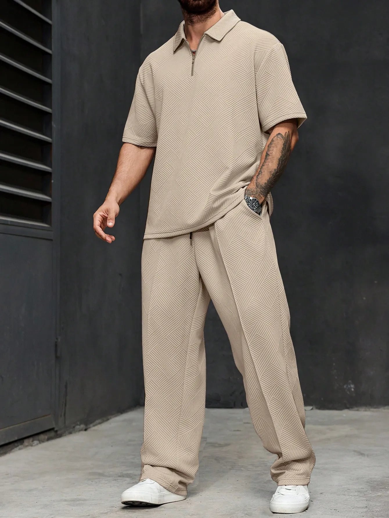 This set includes a short-sleeved polo shirt with a quarter-zip front closure. The matching pants have a wide-leg, straight cut with visible pleats. Both pieces feature a subtle textured weave in the material. The pants have a standard waistband with a zip and button closure.