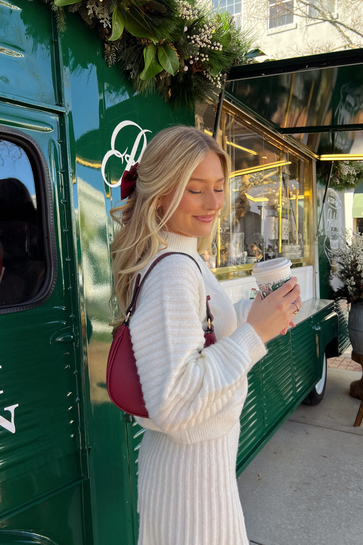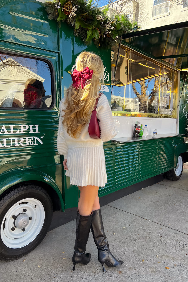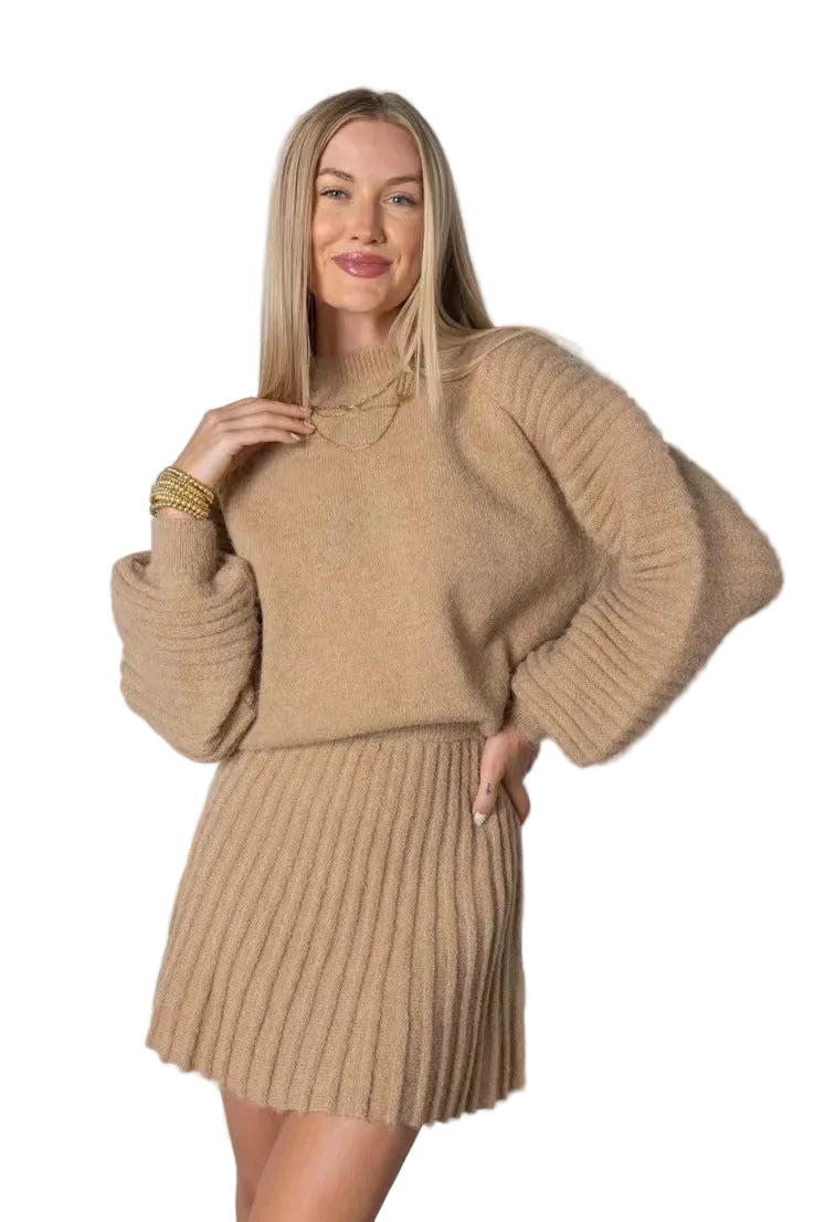This women’s two-piece set includes a knitted top and a matching skirt. The top features long sleeves with a wide, ribbed structure and a round neckline. The skirt has a ribbed design and a short length. Both pieces have a matching knitted texture.