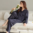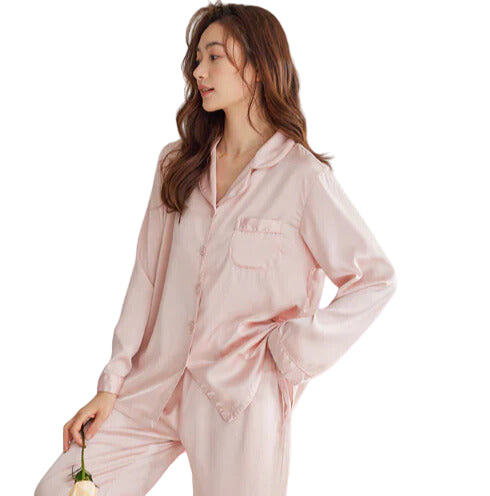 This women’s pyjama set includes a long-sleeve top and matching bottoms. The top features a button closure at the front. It has a notched collar and a chest pocket on one side. The trousers appear full length with a straight cut.