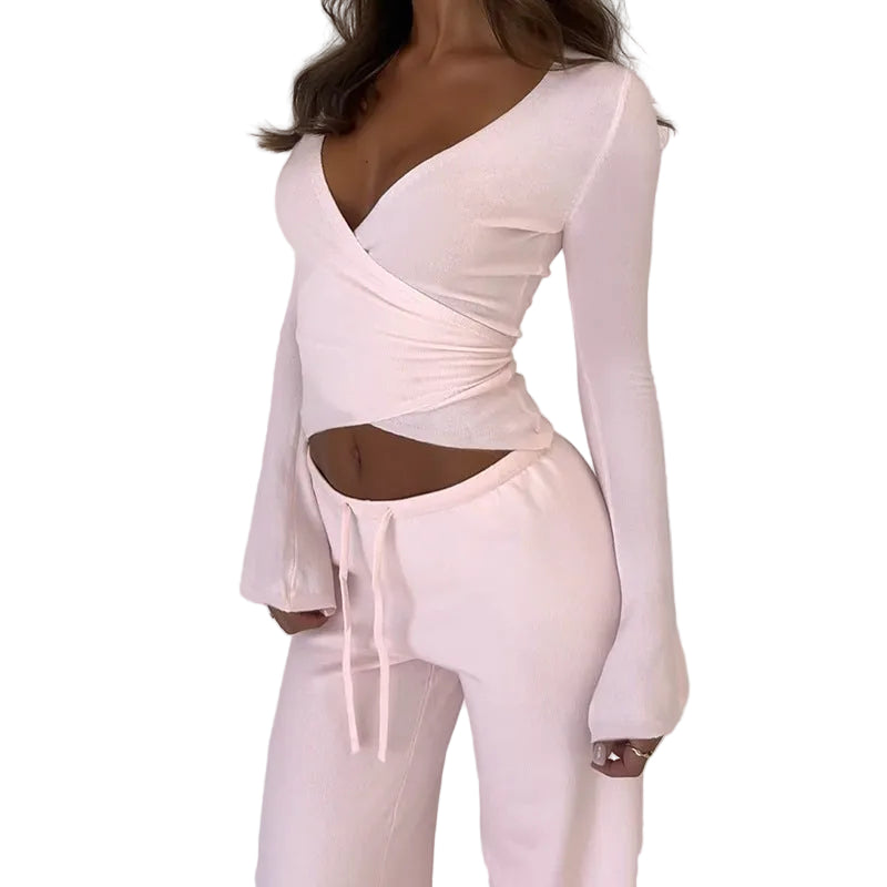 Women’s Two-Piece Set with Long-Sleeve Wrap Top and Waist-Tie Trousers