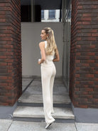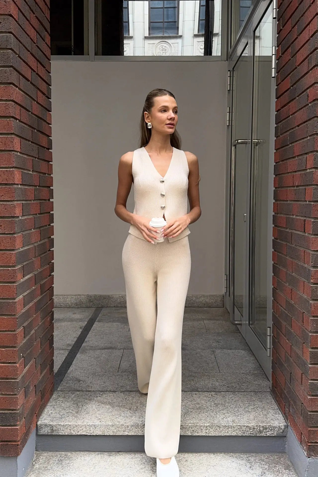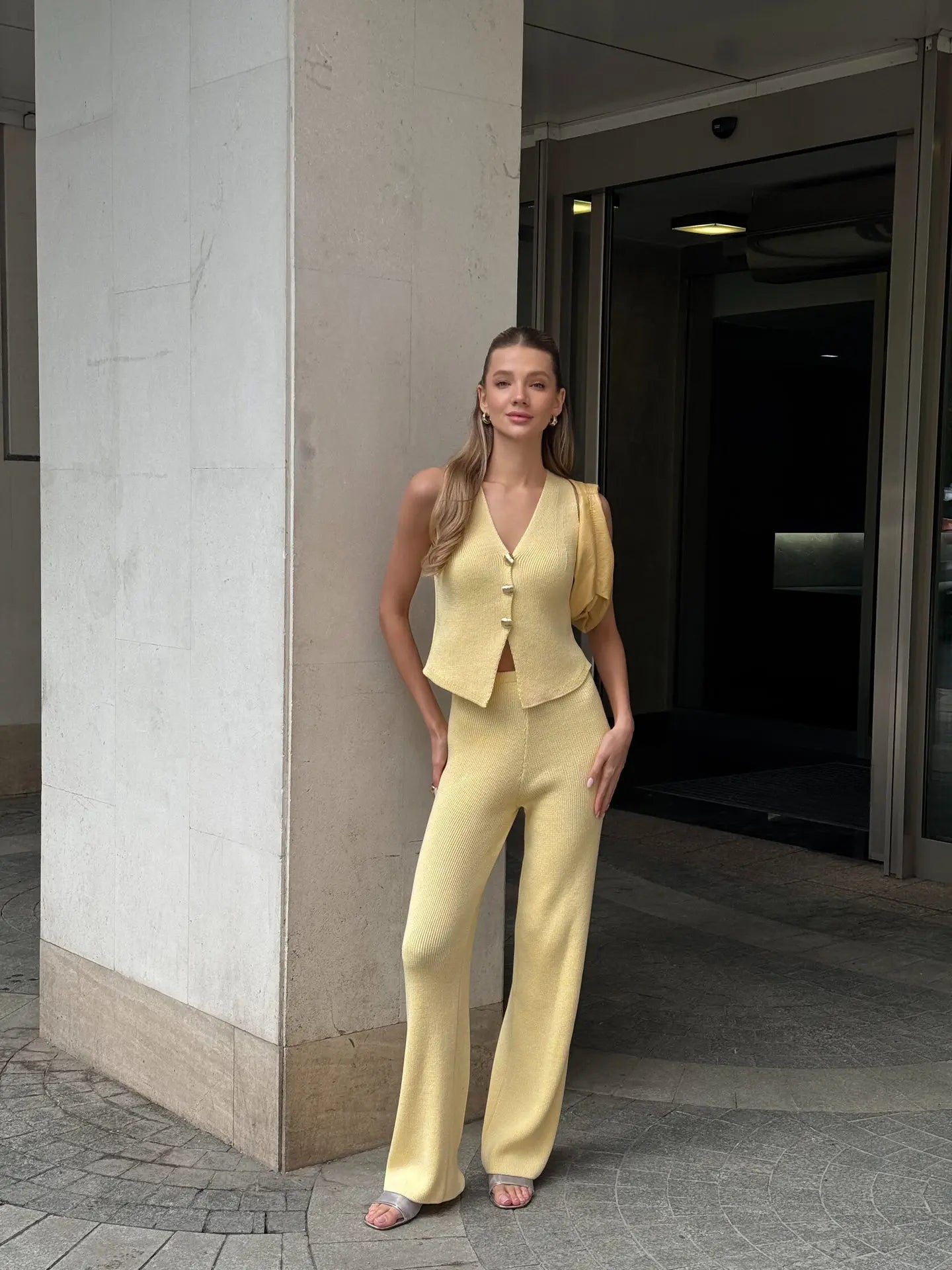 This women’s knitted co-ord set consists of a waistcoat and matching trousers. The vest features a V-neckline and a button closure. The trousers have a straight, full-length leg.