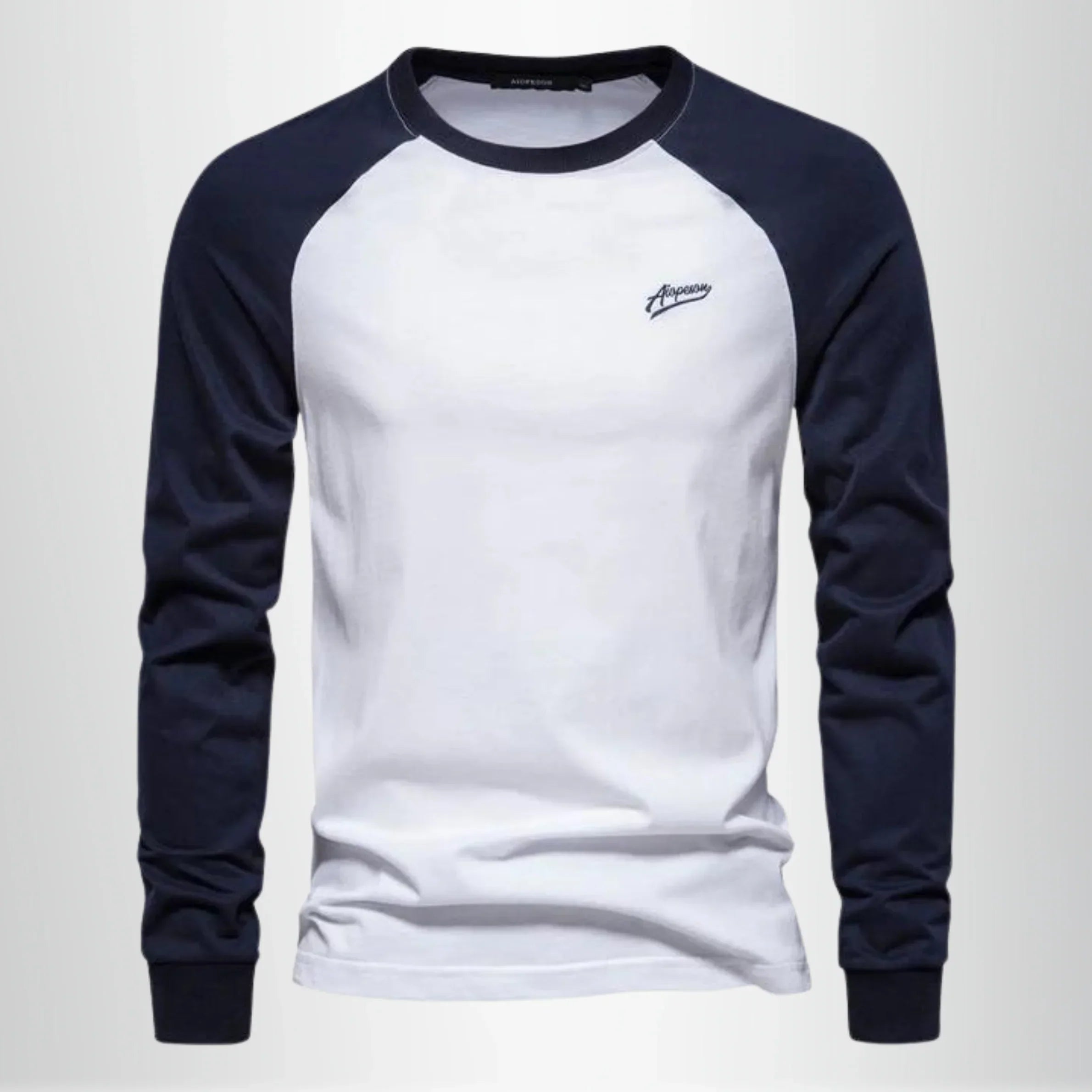 Men’s long sleeve shirt with contrast sleeves. Features a round neckline with a narrow collar trim. Finished with fitted sleeve cuffs.