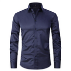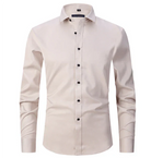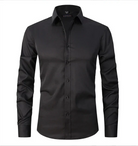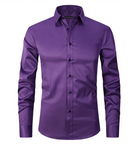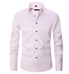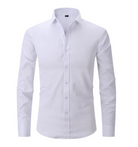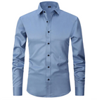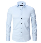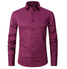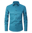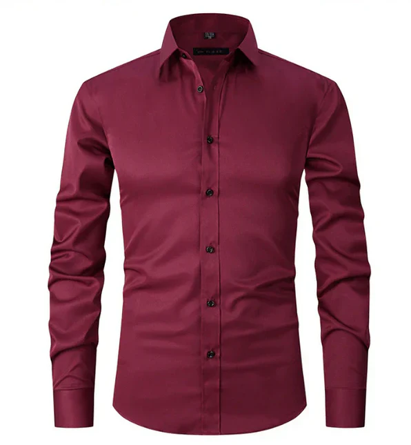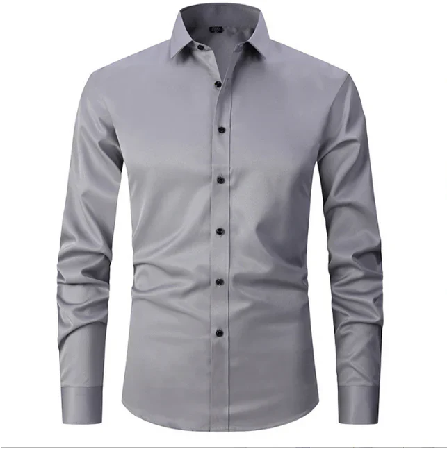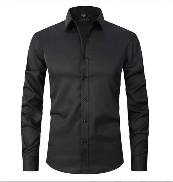 This men’s shirt has a collar and a full button closure. The shirt features long sleeves. It has a straight hemline and a smooth, plain surface.