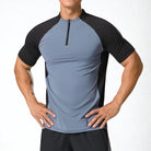 Men’s short sleeve sports t-shirt featuring a round neckline with a half-zip closure. The shirt has contrasting panels on the shoulders and sides. Designed with fitted short sleeves and a straight hemline.
