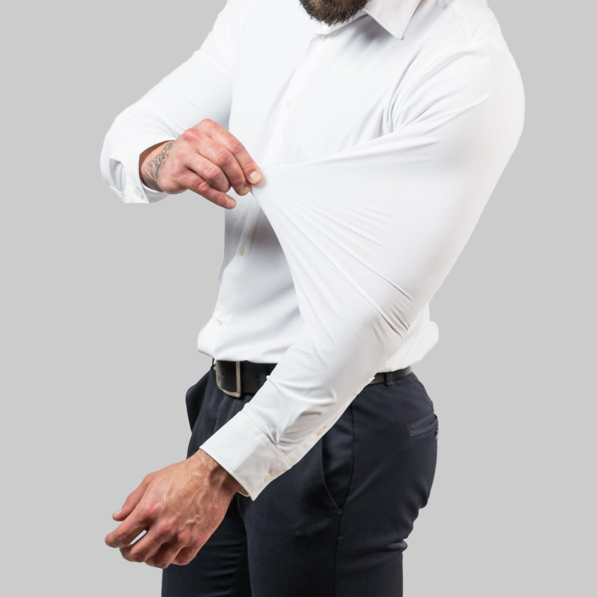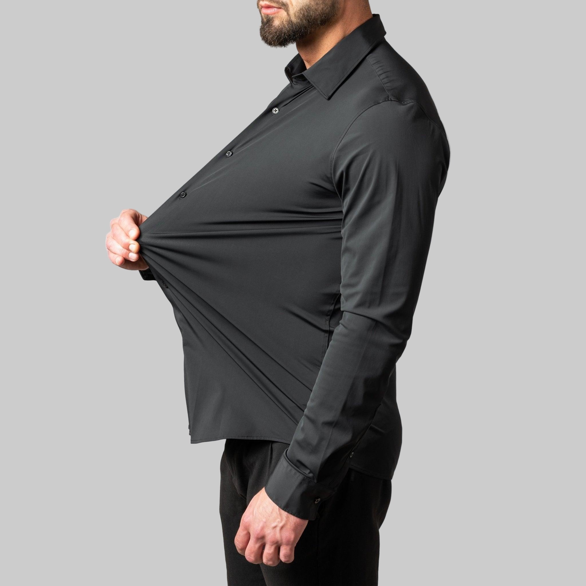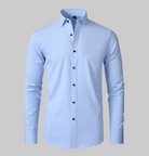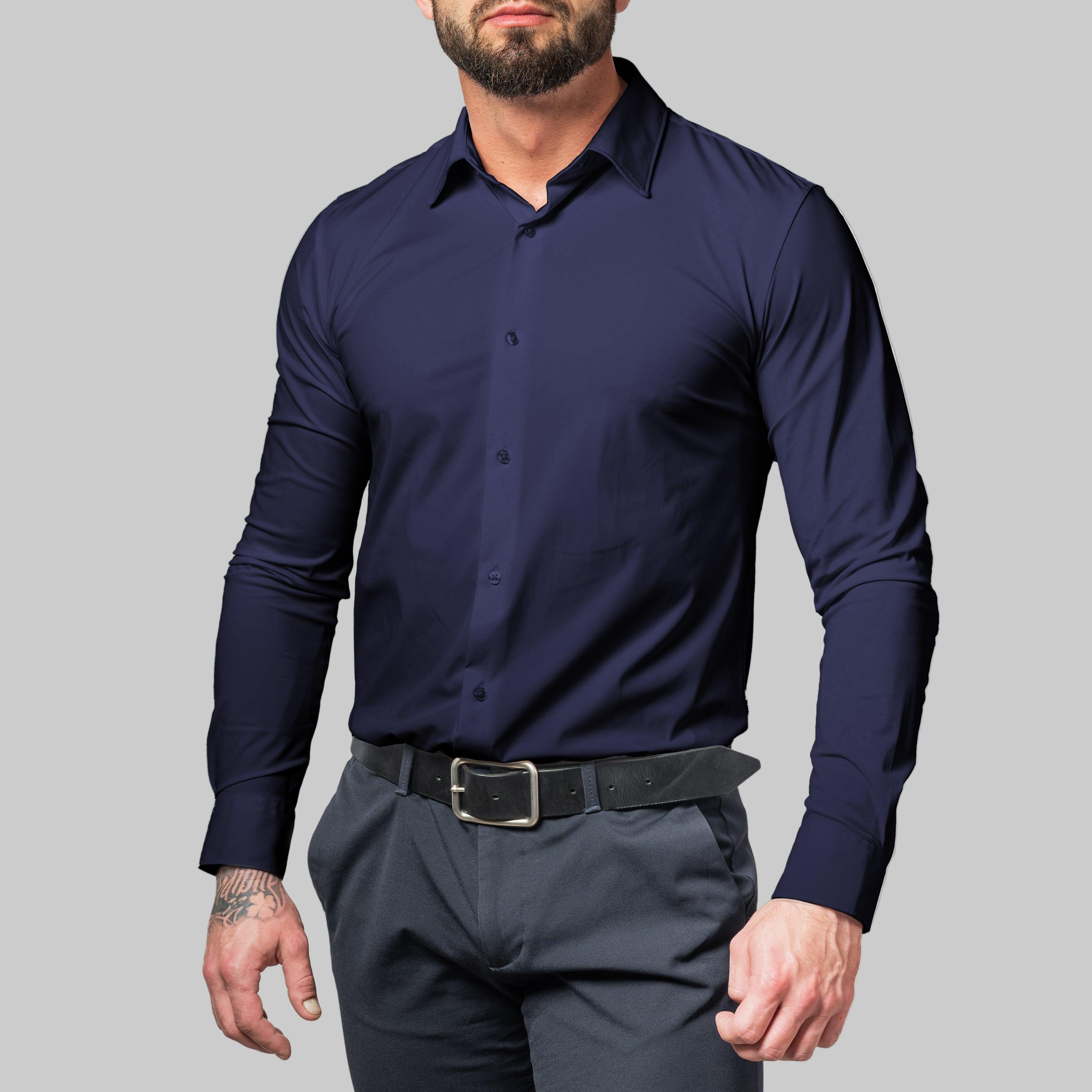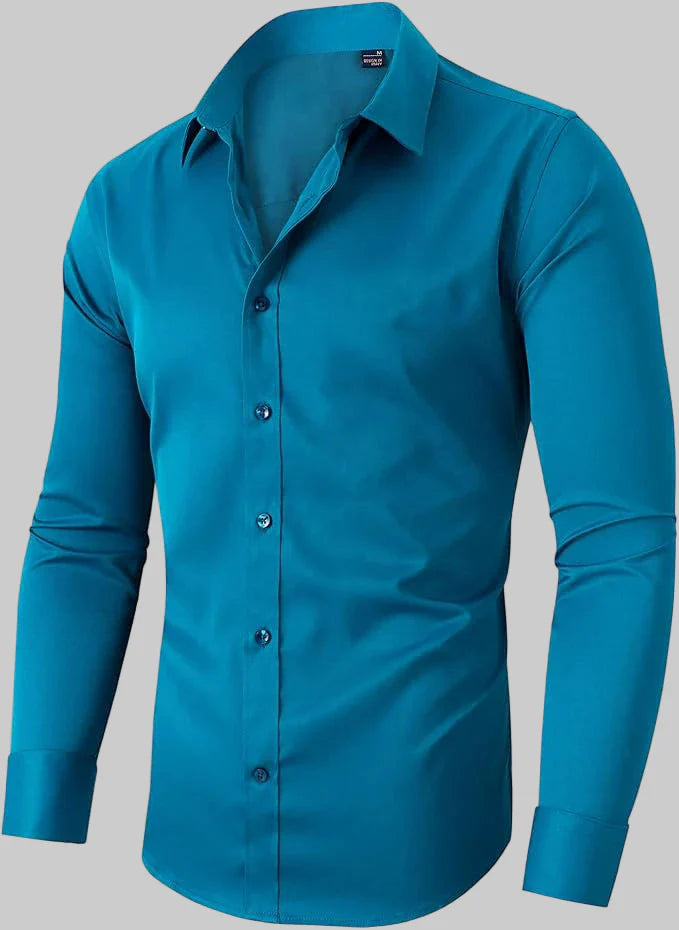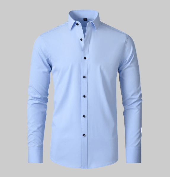 This men's shirt features long sleeves and a pointed collar. It has a full-length button closure. The cuffs are fastened with a single button.