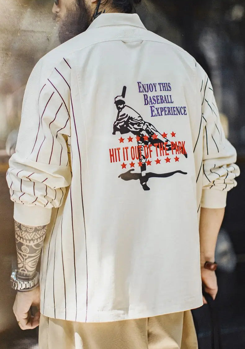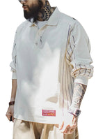 This polo shirt presents long sleeves with thin vertical stripes. The collared neckline maintains a standard polo shirt style. A small rectangular burgundy label with text is positioned on the chest area. The back of the shirt includes printed style elements.
