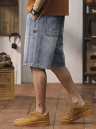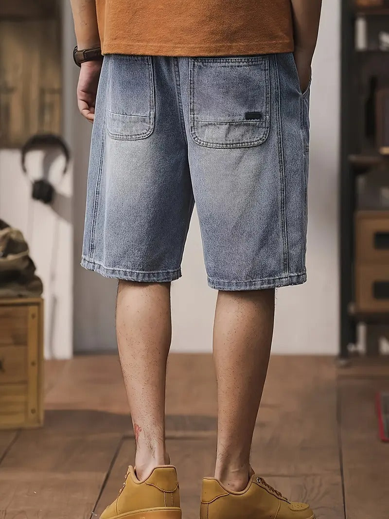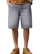 A drawstring waist allows for adjustable fit with cord locks. Two front pockets provide storage space. A brown patch is attached to one of the front pockets.