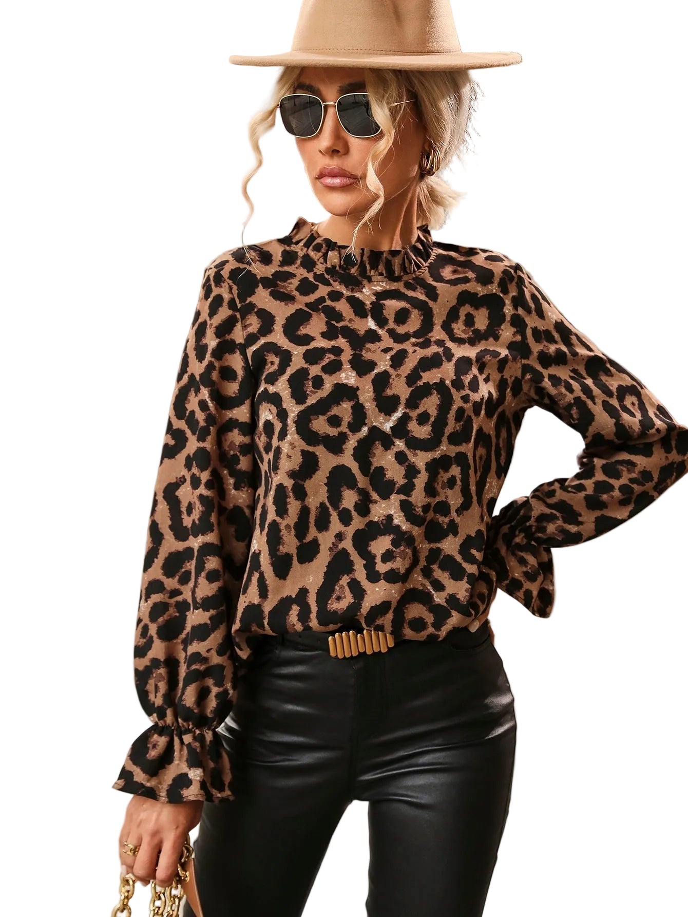 Women’s Leopard Print Blouse with Ruffled Neckline