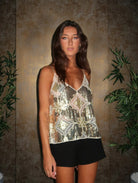 This women’s sleeveless top features thin shoulder straps and a V-shaped neckline at the front. The top has a semi-transparent structure with an all-over sequin pattern. The back mirrors the front with a low V-shaped neckline.