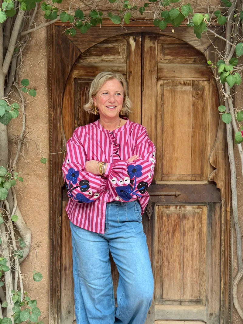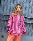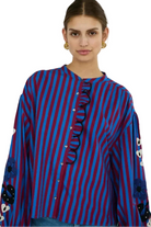 This women’s blouse features a round neckline and a striped pattern. It has long balloon sleeves with gathered cuffs. The front features a button closure. On the sleeves there are visible printed designs.