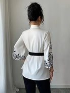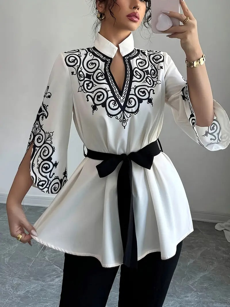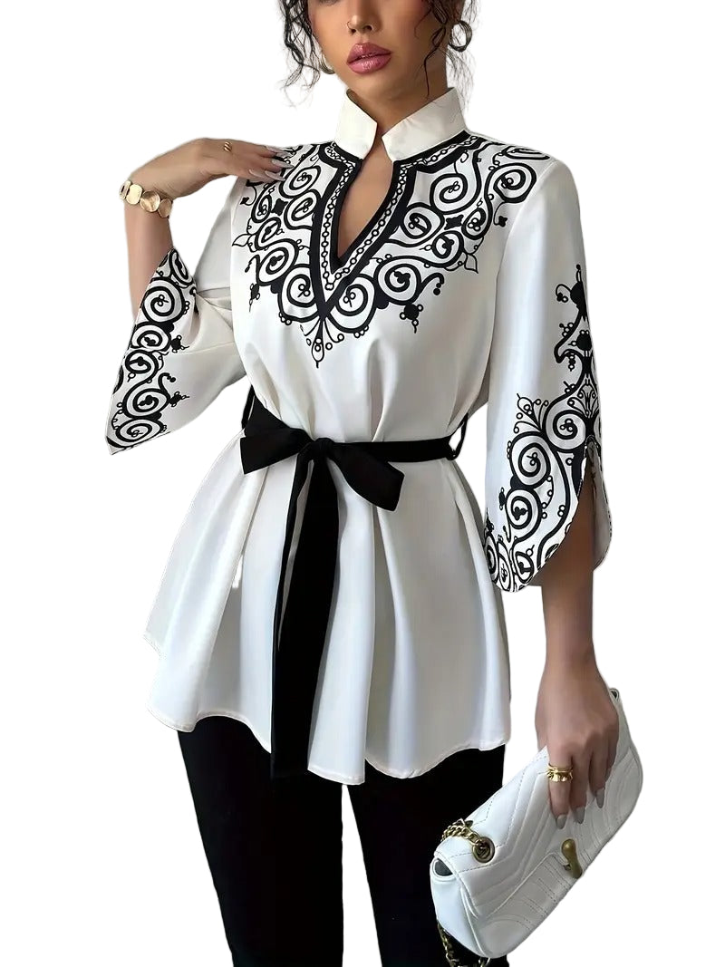 This blouse offers swirl and floral patterns throughout the garment. A collared neckline has a deep V-shaped opening at the front. Three-quarter length sleeves include a cutout print near the elbow area. A ribbon belt fastens at the waist above the flared peplum section.