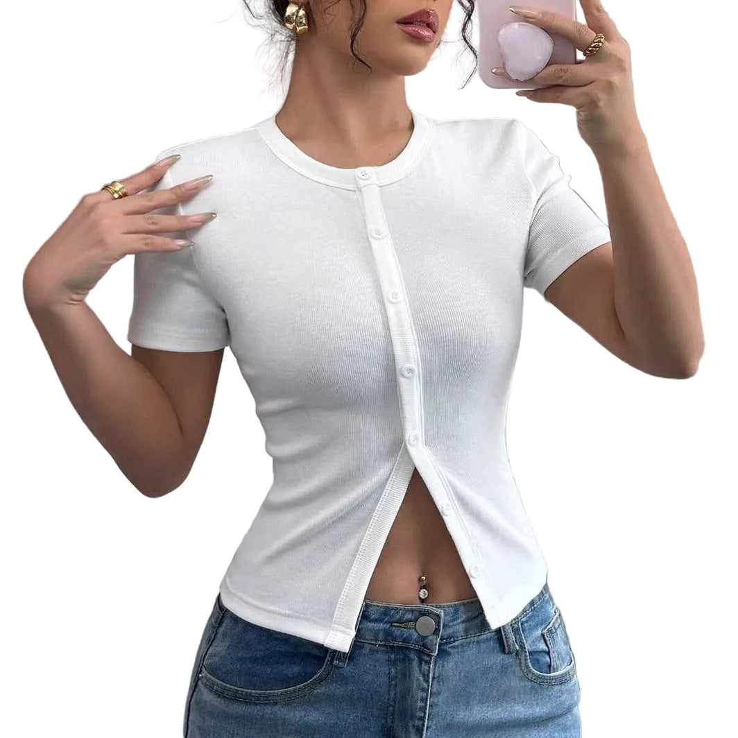 Women’s Short Sleeve Buttoned Top with Round Neckline