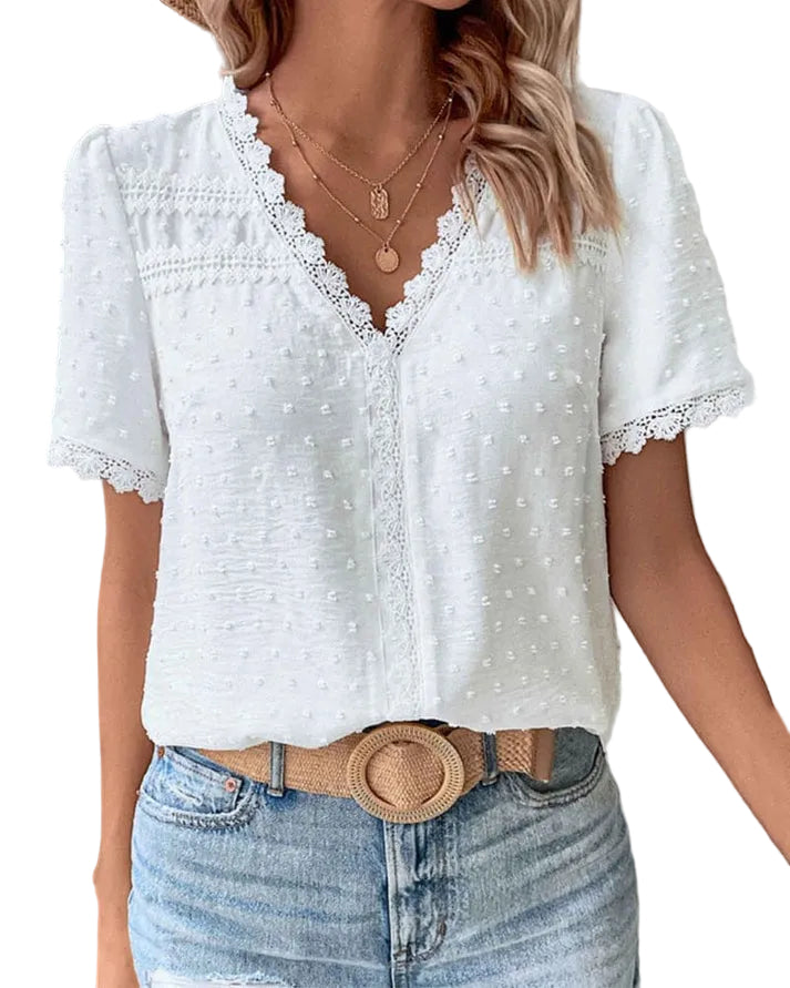 Women’s White Blouse with Lace Trim and Short Sleeves