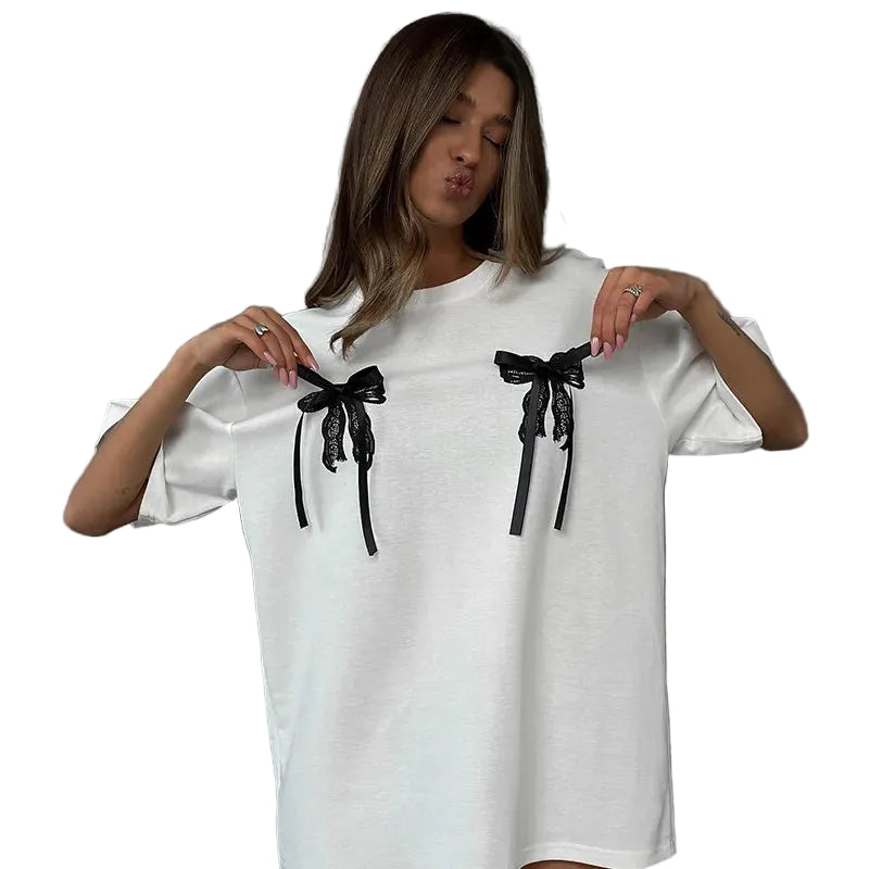 Women’s White Short Sleeve Top with Round Neckline and Bow Details
