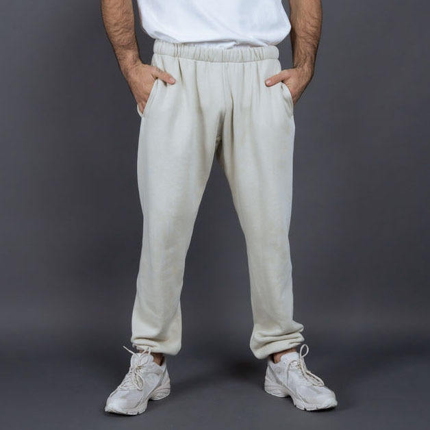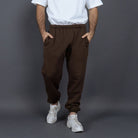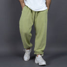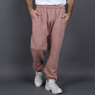 These men’s joggers feature an elastic waistband. The trousers have a loose straight-leg shape. Side pockets are visible on both sides. The hems are elasticated. The joggers are made of cotton.