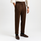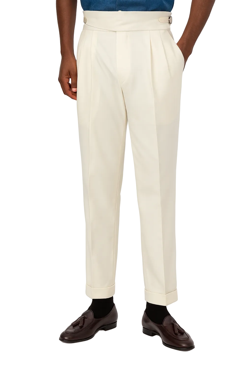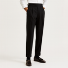 These men’s trousers feature a high-rise waist and a full-length cut. A pleated front is visible at the waist. Side adjusters are present instead of belt loops.