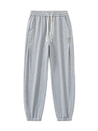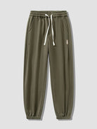 These men's joggers are made from cotton material. The bottoms feature an elasticated waist with an adjustable, visible drawstring. There are two pockets located on the sides. The ankles have elasticated cuffs for a tapered fit.