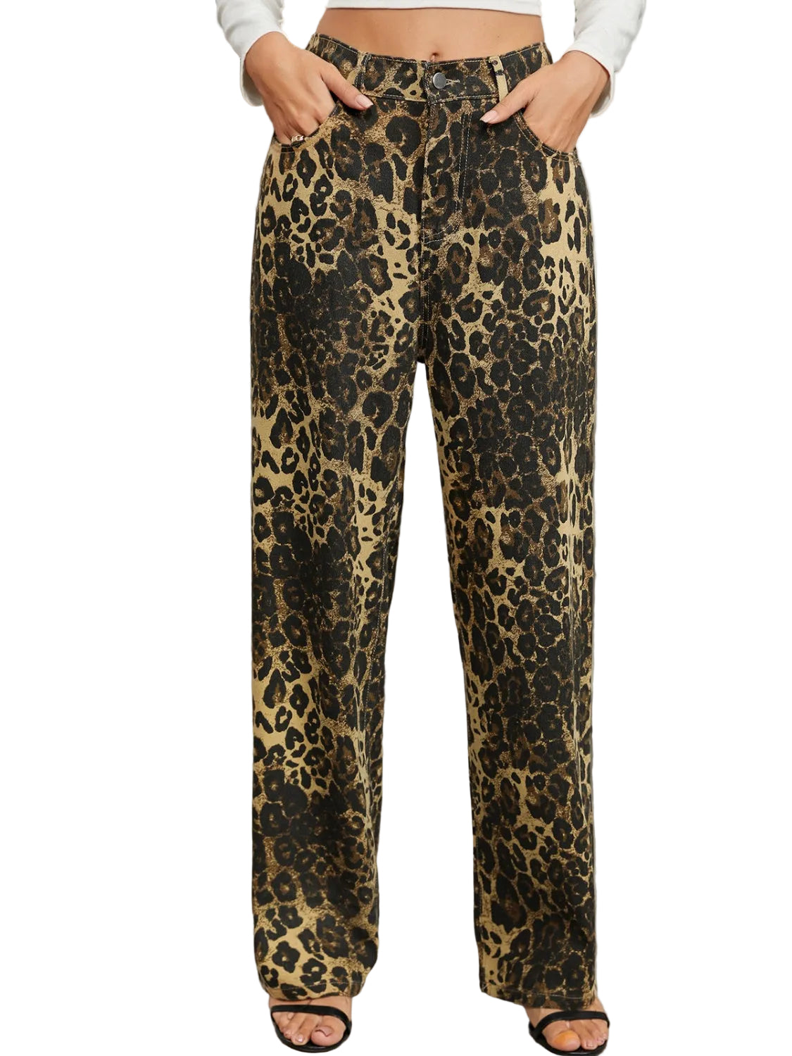 These women’s trousers feature an all-over leopard print design. They have a button and zip closure. Front and back pockets are visible.