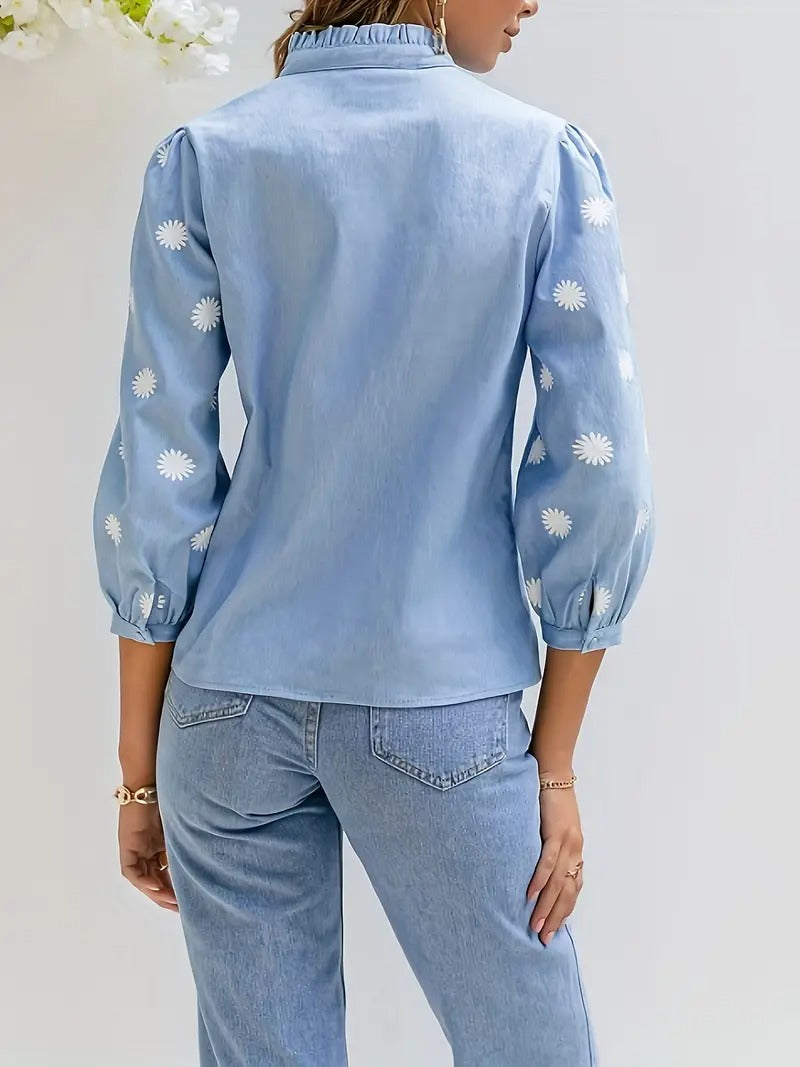 This shirt presents a base with embroidered daisy flowers and leaves. The notched collar frames a full button-down front closure. Three-quarter length sleeves have a slightly puffed shape from shoulder to cuff. The embroidery extends vertically along the front and continues onto both sleeves.